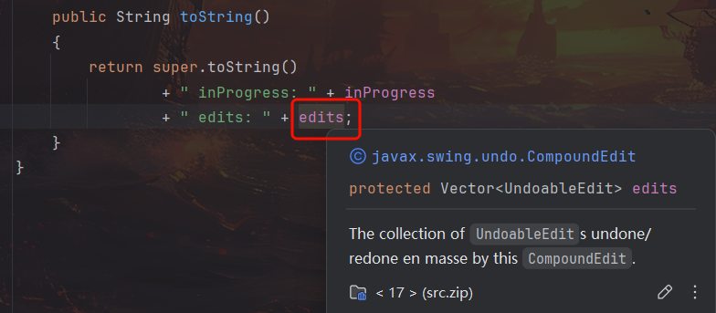 于是可以查看 super.toString()即 CompoundEdit.toString(),此处 edits 属性为 Vector 类的对象,字符串与对象拼接再次隐式触发 Vector 的 toString 方法