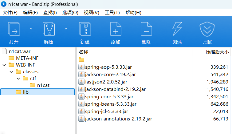 而后我又尝试了探测 pom.xml 等配置文件期望从中获取所有依赖和版本信息(虽然默认 war 包是没什么这种文件的,但万一用的是 maven 或者 Gradle 之类的呢),然而事实上并没有找到。由于当时还是耐心不够,只 fuzz 了 class 文件和一些常见配置文件,没去把依赖的一个个搞出来,后面做题也没找到可用的利用链,基本就 game over 了,想想还是有点傻。。。还是要多试。