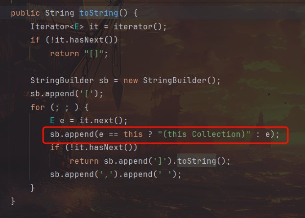 最终到达 AbstractCollection.toString(),此处获取一个当前集合的迭代器,而后遍历该 Vector 中存储的对象